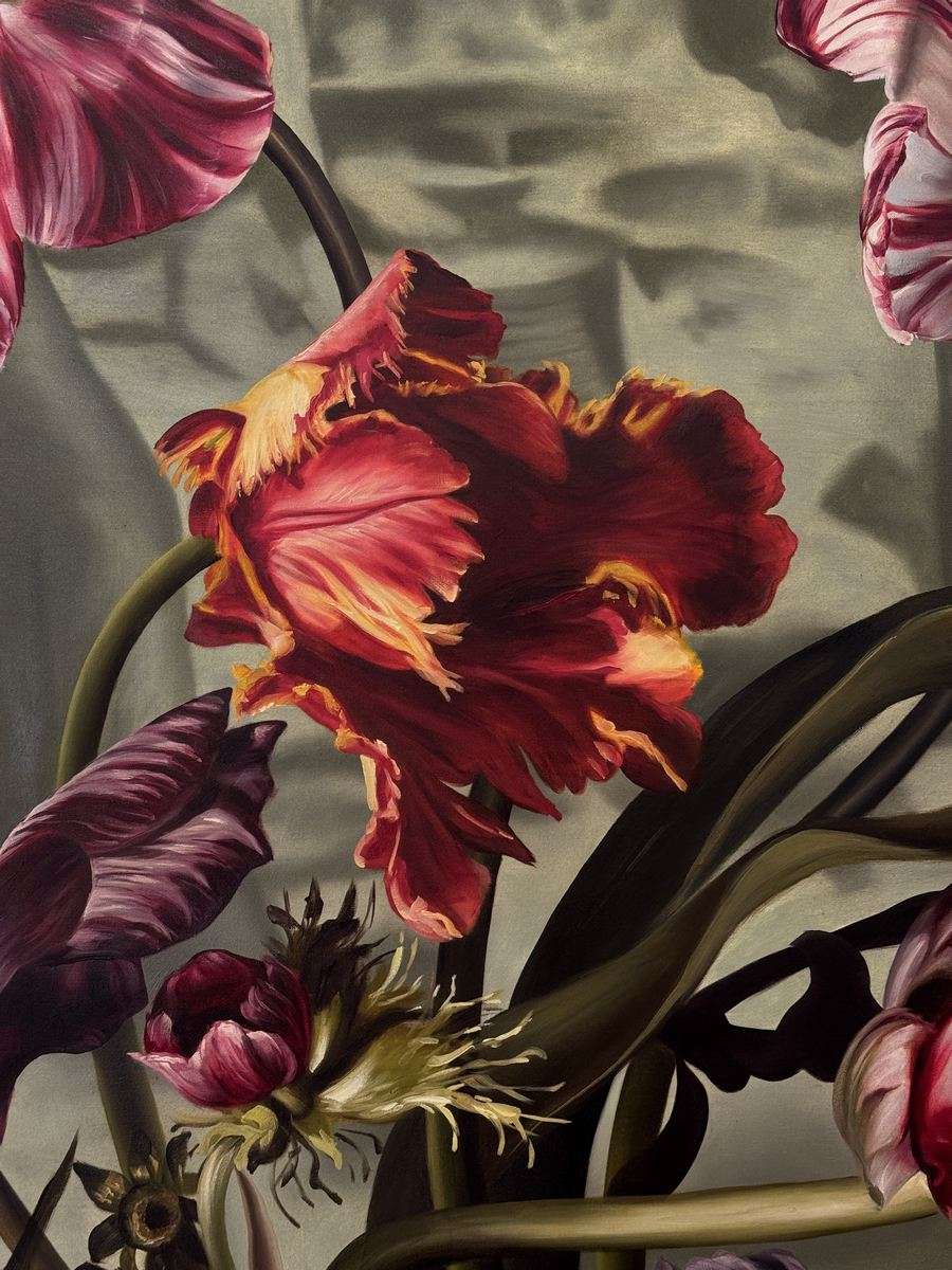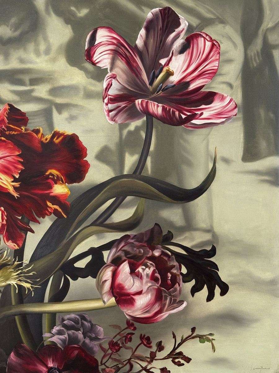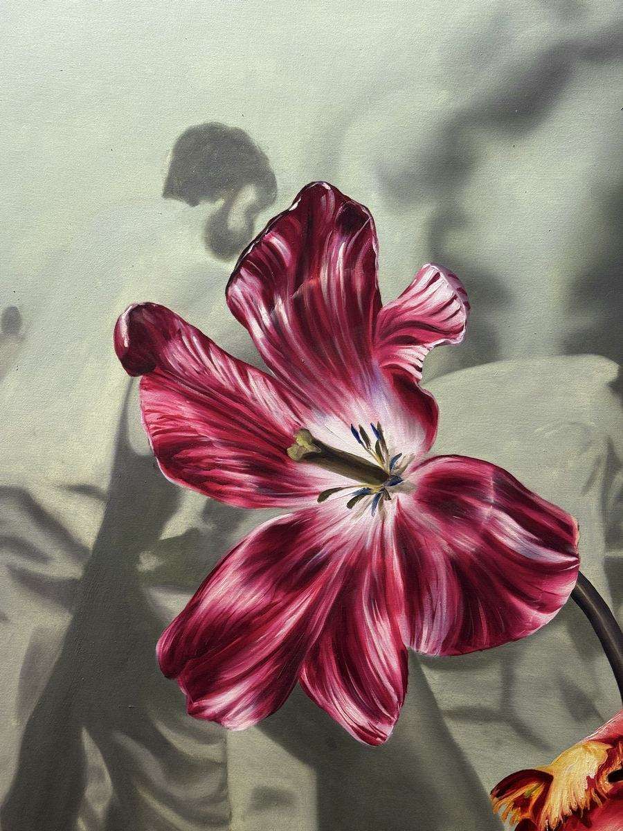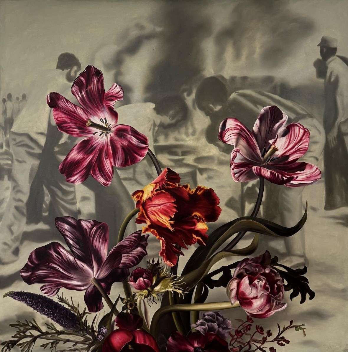 Roghayeh Najdi (born 1982, Tabriz) is a contemporary Iranian painter who, with a figurative and surreal approach, deals with issues such as identity, memory, and female experiences. Her works create narrative and psychoanalytic spaces by combining human and natural elements, poetic coloration, and symbolic signs;Spaces that sometimes suspend identity by blurring or deleting faces and turning figures into human symbols.